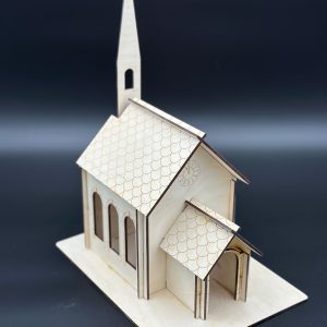 Laser-gezeichnete Dachziegel: Ein besonderes Qualitätsmerkmal sind die Laser-gezeichneten Dachziegel. Diese feinen, präzisen Gravuren verleihen dem Dach eine realistische, strukturierte Textur, die von herkömmlichen Bastelmaterialien nicht erreicht wird. Diese Liebe zum Detail macht die Laser-gezeichnete Holzkirche zu einem besonders edlen Objekt.