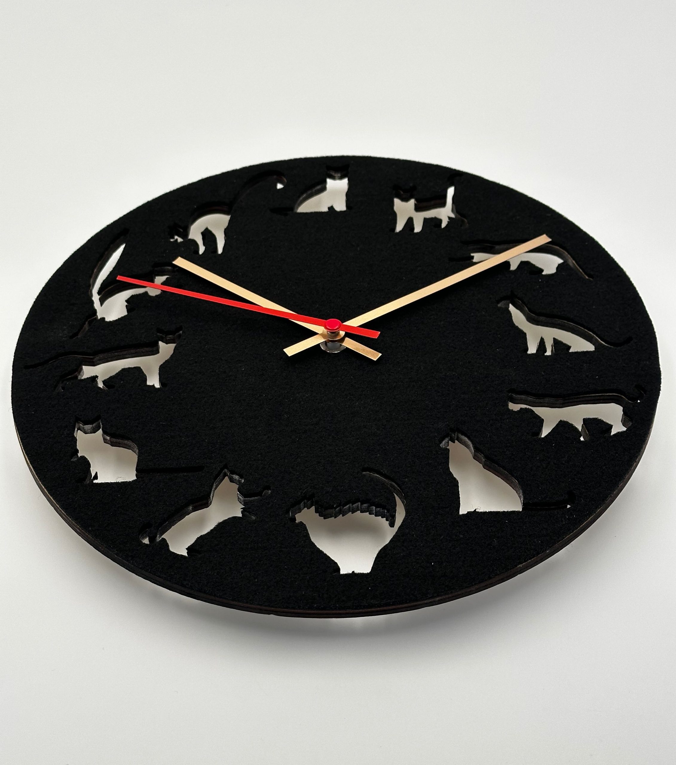 Hinter den ausgeschnittenen Katzen-Silhouetten befindet sich der Kontrast-Garant: Die Rückwand der Uhr ist sorgfältig mit hochwertigem, tiefschwarzem Filz beklebt.
