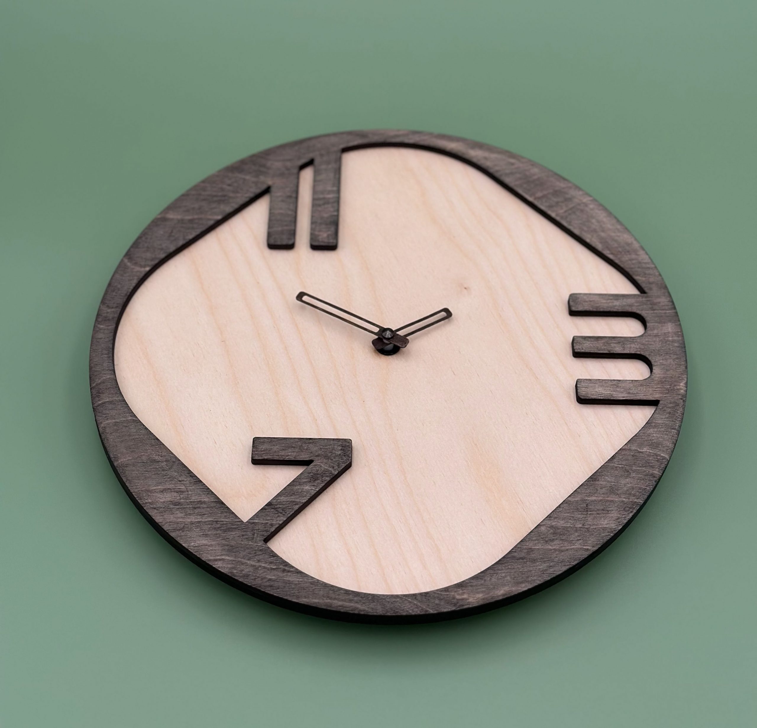 Die filigranen, kleinen schwarzen Zeiger bilden einen eleganten und kontrastreichen Akzent zur hellen Holzoberfläche. Sie sorgen für eine präzise Zeitangabe und fügen sich harmonisch in das Gesamtbild ein, ohne die Schönheit der Holzstruktur zu überdecken.