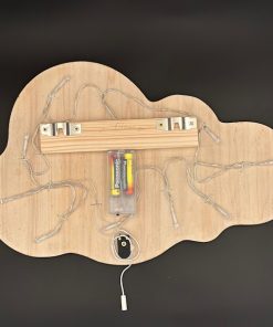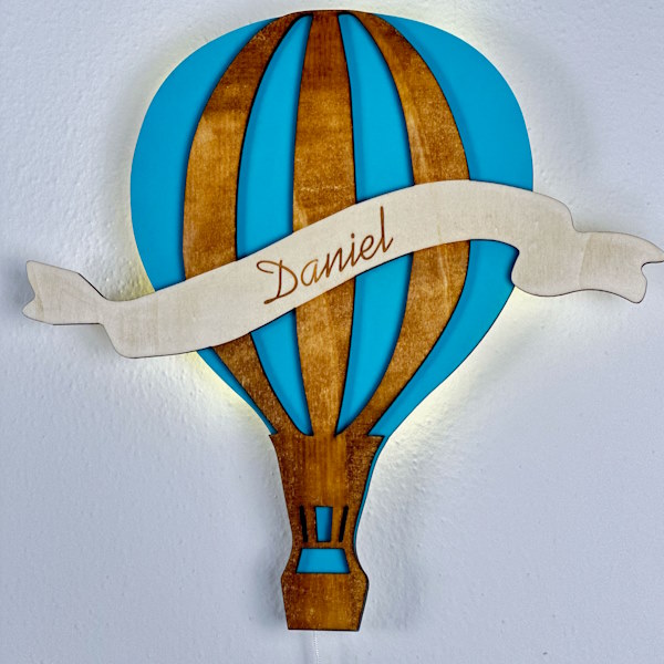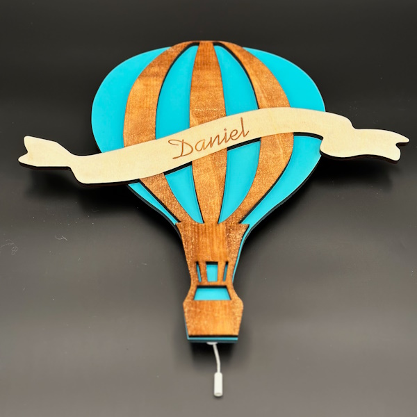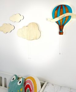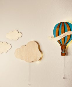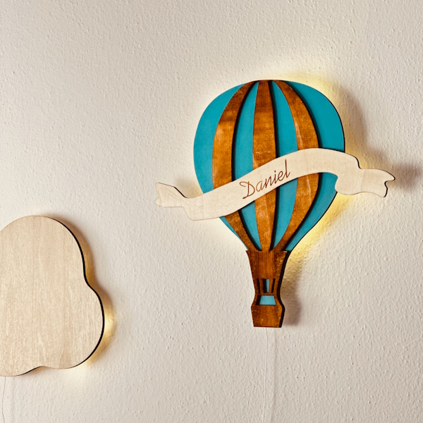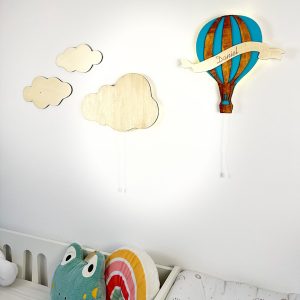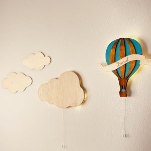 Kinderzimmerdeko – Heißluftballon mit Wolke als Wandleuchten und 2 Wolken als Wanddekoration. Heißluftballonleuchte ist dreischichtig. Eine Schickt ist türkisblau.
