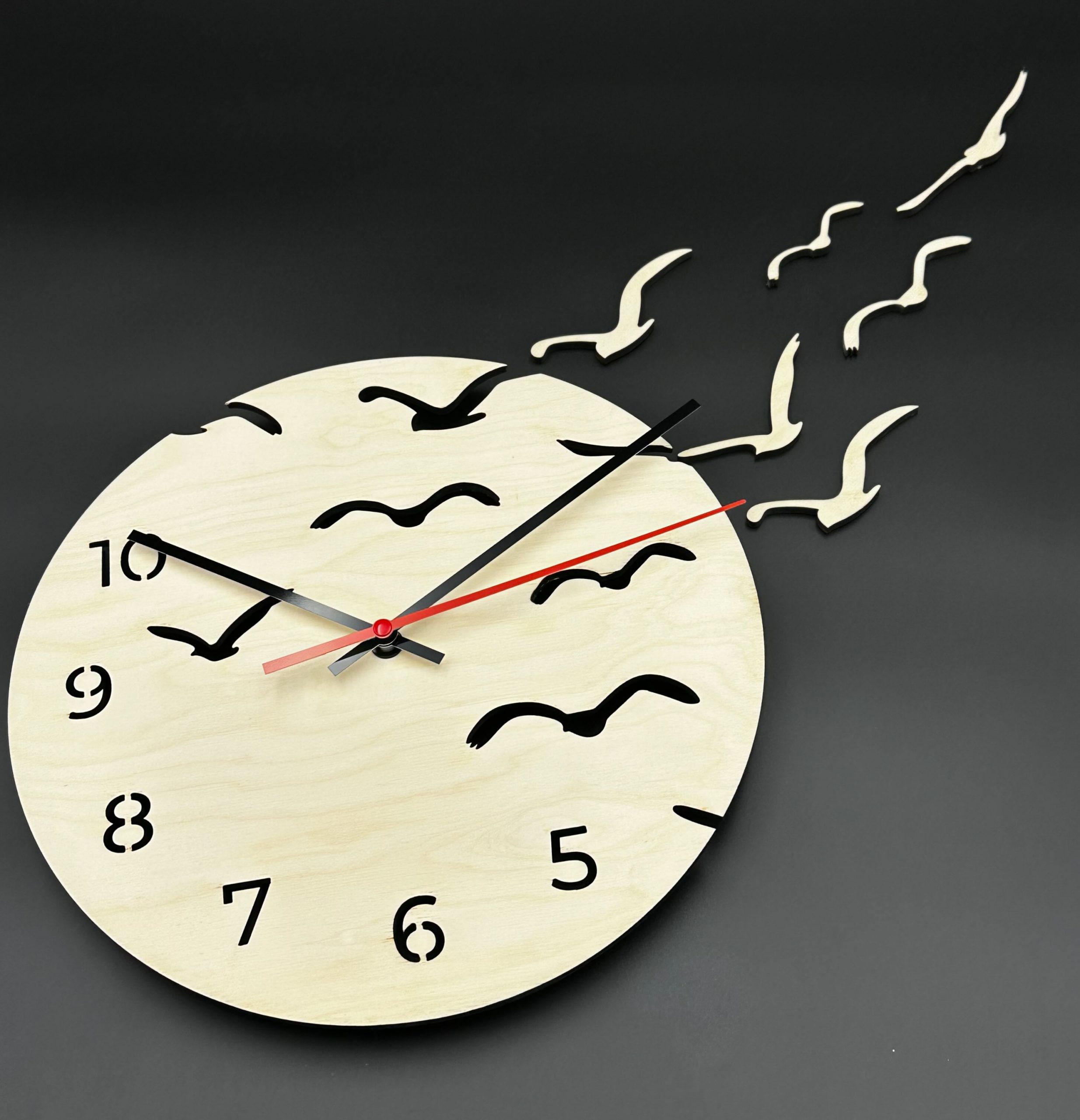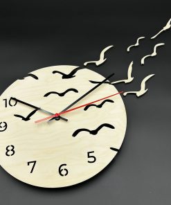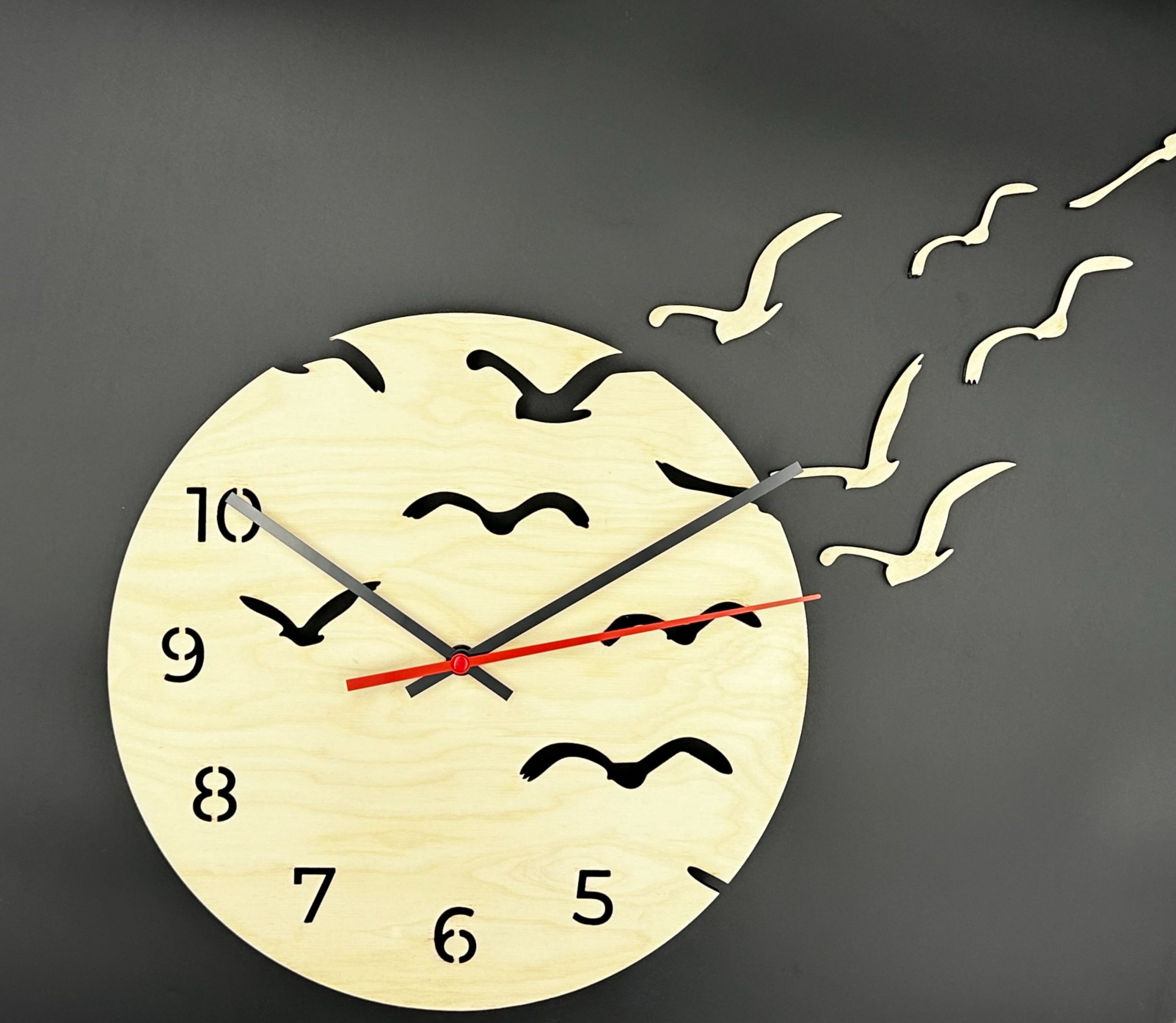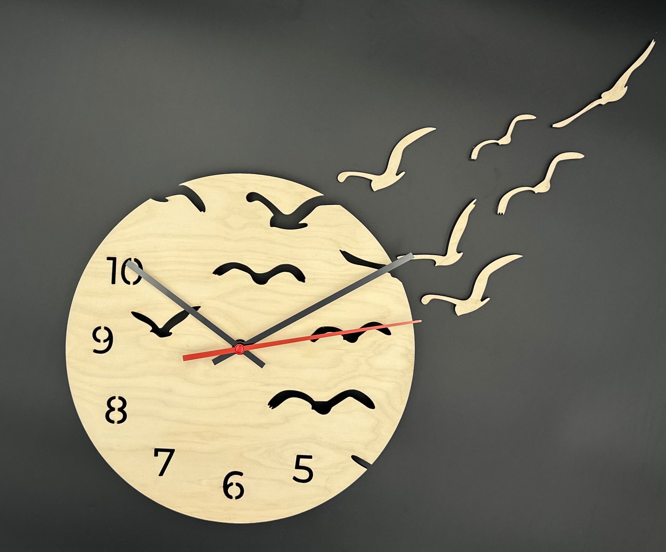 Runde Holzuhr, naturbelassenes Holz, Wanduhr Vögel, herausnehmbare Vögel, ausgeschnittene Ziffern, Natur-Wanduhr, interaktive Holzuhr, Echtholz-Uhr