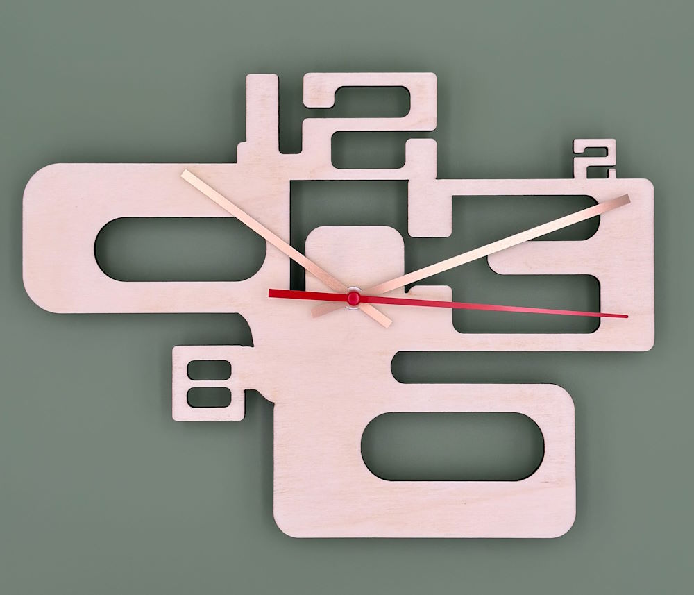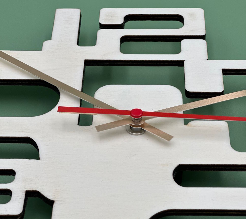 • Stundenzeiger: schwarzes und rotes Metall (Minuten: 16 cm, Stunden: 11 cm, Sekunden: 19 cm).